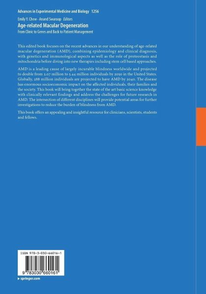 AMD is a leading cause of largely incurable blindness worldwide and projected to double from 2.07 million to 5.44 million individuals by 2050 in the United States. Globally, 288 million individuals are projected to have AMD by 2040. The disease has enormous socioeconomic impact on the affected individuals, their families and the society. This book will bring together the state of the art basic science knowledge with clinically relevant findings and address the challenges for future research in AMD. The intersection of different disciplines will provide potential areas for further investigations to reduce the burden of blindness from AMD.