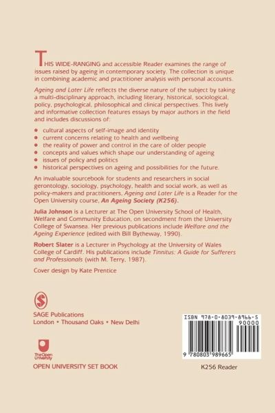 Ageing and Later Life reflects the diverse nature of the subject by taking a multidisciplinary approach including literary, historical, sociological, policy, psychological, philosophical and clinical perspectives. This lively and informative book features essays by major authors in the field and includes discussions of: cultural aspects of self-image and identity; current concerns relating to health and well-being; the reality of power and control in the care of older people; concepts and values which shape our understanding of ageing; issues of policy and politics; and historical perspectives on ageing and possibilities for the future. Ageing and Later Life is a set book for The Open University course K256 An Ageing Society.