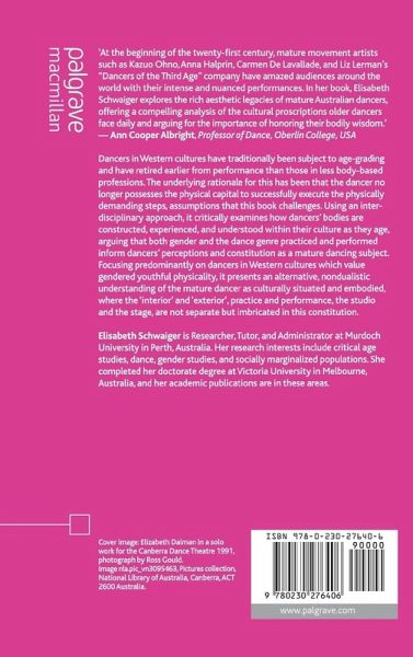 'At the beginning of the twenty-first century, mature movement artists such as Kazuo Ohno, Anna Halprin, Carmen De Lavallade, and Liz Lerman's 'Dancers of the Third Age' company have amazed audiences around the world with their intense and nuanced performances. In her book, Elisabeth Schwaiger explores the rich aesthetic legacies of mature Australian dancers, offering a compelling analysis of the cultural proscriptions older dancers face daily and arguing for the importance of honoring their bodily wisdom.' - Ann Cooper Albright, Professor of Dance, Oberlin College, USA
