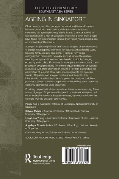 Older persons are often portrayed as social and financial burdens because pensions, health and social care have to withstand increasing old age dependency ratios. Due to a lack of access to representation or a lack of social and economic power, older people have found few opportunities to have their voices heard, making age an immensely political issue. Written by an impressive team of authors, this book provides an in-depth analysis of the experience of ageing in Singapore examining key issues such as health, work, housing, family ties and care giving. It looks at how social categorization enters into everyday life to elucidate the multiple meanings of age and identity encountered in a rapidly changing economy and society. Providing original critical discourse from Asian writers recording Asian voices, Ageing in Singapore will appeal to a wide readership and is an invaluable resource for policy makers, service practitioners and scholars working on Asian gerontology.