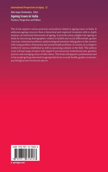 This book explores various practices and policies related to ageing issues in India. It addresses ageing concerns from a theoretical and empirical viewpoint with in-depth analyses of existential dimensions of ageing. It provides deep insights into ageing in India by discussing demographics related to health and social differentials, gender concerns, retirement problems, epidemiological transition taking place in the country with rising problem of dementia and mental health problems. It consists of 23 chapters written by various established as well as upcoming scholars in the field. The authors cover a broad range of topics with regard to provisions for institutional care, geriatric practice and emerging issues of elder abuse. The book will appeal to professionals and to lay people getting interested in ageing India from a social, health, gender, economic, psychological and emotional aspects.