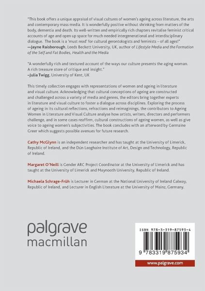 1. Introduction; Cathy McGlynn, Margaret O'Neill & Michaela Schrage-Früh.- Part I: NARRATIVES OF AGEING.- 2. Making the Invisible Visible: The Presence of Older Women Artists in Early Modern Artistic Biography; Julia K. Dabbs.- 3. Losing One's Self: The Depiction of Female Dementia Sufferers in Iris (2001) and The Iron Lady (2011); Eva Adelseck.- 4. "Embarking, Not Dying": Clare Boylan's Beloved Stranger as Reifungsroman; Michaela Schrage-Früh.- 5. Intersection, Interoception and Interruption: The Age Performances of Peggy Shaw; Bridie Moore.- II: SOCIAL ROLES: MOTHERS, WIDOWS, SPINSTERS.- 6. Closing In: Spatial Restrictions for Ageing Mothers in Jane Austen; Amber Jones.- 7. "No One Noticed Her": Ageing Spinsters and Youth Culture in Sylvia Townsend Warner's Short Stories; Cathy McGlynn.- 8. Stories of Motherhood and Ageing in ABC's Television Programme Once Upon a Time; Katherine Whitehurst.- 9. "She Says She's Thirty-Five but She's Really Fifty-One": Rebranding the Middle-Aged Postfeminist Protagonist in Helen Fielding's Bridget Jones: Mad about The Boy; Lucinda Rasmussen.- Part III: THE BODY AND EMBODIMENT; 10. Older Women and Sexuality On-Screen: Euphemism and Evasion?; Susan Liddy.- 11. A Certain Truth in Fiction: Perceptions of the Ageing Process in Irish Women's Fiction; Theresa Wray.-12. Future and Present Imaginaries: The Politics of the Ageing Female Body in Lena Dunham's Girls (HB0, 2012 - present); Ros Jennings and Hannah Grist.-13. The New Model Subject: 'Coolness' and the Turn to Older Women Models in Lifestyle and Fashion Advertising.- Deborah Jermyn and Anne Jerslev.- 14. Performances of Situated Knowledge in the Ageing Female Body; EL Putnam.- Part IV: CLASS, RACE AND AGENCY.- 15. "I Become Shameless as a Child": Childhood, Femininity and Older Age in J. M. Coetzee's Age of Iron; AntoinettePretorius.-16. African American Humour and the Construction of a Mature Female Middle-Class Identity in Clarence Major's Such Was the Season; Saskia Marguerita Fürst.-17. "This is How Time Unfolds When You Are Old": Ageing, Subjectivity and Joseph O'Connor's Ghost Light; Margaret O'Neill.- 18. The Visibility of Women's Ageing and Agency in Suzanne Lacy's The Crystal Quilt (1987) and Silver Action (2013); Kate Antosik-Parsons. 19. Afterword; Germaine Greer.