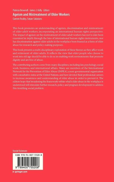 This book promotes an understanding of ageism, discrimination and mistreatment of older adult workers, incorporating an international human rights perspective. The impact of ageism on the mistreatment of older adult workers has not to date been examined in depth through the lens of international human rights instruments, nor has discrimination against older adults in the workplace been framed as a form of elder abuse for research and policy making purposes.