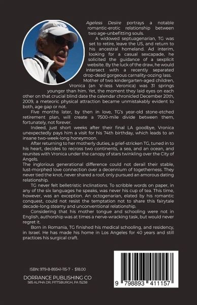 Ageless Desire portrays a notable romantic-erotic relationship between two age-unbefitting souls. A widowed septuagenarian, TG was set to retire, leave the US, and return to his ancestral homeland. Ad interim, looking for a casual sexcapade, he solicited the guidance of a sexplicit website. By the luck of the draw, he would intersect with a recently separated drop-dead gorgeous carnality-oozing lass. Mother of two kindergarten-aged children, Vronica (an 'e'-less Veronica) was 31 springs younger than him. Yet, the moment they laid eyes on each other on that crucial blind date the calendar chronicled December 20th, 2009, a meteoric physical attraction became unmistakably evident to both, age gap or not. Five months later, by then in love, TG's year-old stone-etched retirement plan, will create a 7500-mile divide between them, fortunately, not forever. Indeed, just short weeks after their final LA goodbye, Vronica unexpectedly pays him a visit for his 74th birthday, which leads to an insane two-week-long honeymoon. After returning to her motherly duties, a grief-stricken TG, tuned in to his heart, decides to recross two continents, a sea, and an ocean, and reunites with Vronica under the canopy of stars twinkling over the City of Angels. The inglorious generational difference could not derail their stable, lust-morphed love connection over a decennium of togetherness. They never tied the knot, never shared a roof, only pursued an amorous dating relationship. About the Author TG never felt belletristic inclinations. To scribble words on paper, in any of the six languages he speaks, was never his cup of tea. This time, however, was an exception. An octogenarian, elated by his romantic conquest, could not resist the temptation not to share this fairytale decade-long steamy and unconventional relationship. Considering that his mother tongue and schooling were not in English, authorship was at times a nerve-wracking task, but would never regret it. Born in Romania, TG finished his medical schooling, and residency, in Israel. He has made his home in Los Angeles for 40 years and still practices his surgical craft.