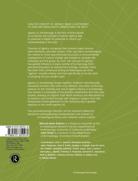 Agency in Archaeology is the first critical volume to scrutinise the concept of agency and to examine in-depth its potential to inform our understanding of the past. Theories of agency recognise that human beings make choices, hold intentions and take action. This offers archaeologists scope to move beyond looking at broad structural or environmental change and instead to consider the individual and the group Agency in Archaeology brings together nineteen internationally renowned scholars who have very different, and often conflicting, stances on the meaning and use of agency theory to…mehr