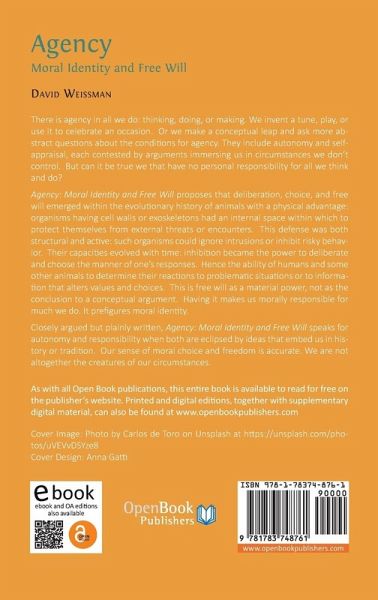 There is agency in all we do: thinking, doing, or making. We invent a tune, play, or use it to celebrate an occasion. Or we make a conceptual leap and ask more abstract questions about the conditions for agency. They include autonomy and self-appraisal, each contested by arguments immersing us in circumstances we don't control. But can it be true we that have no personal responsibility for all we think and do? Agency: Moral Identity and Free Will proposes that deliberation, choice, and free will emerged within the evolutionary history of animals with a physical advantage: organisms having cell walls or exoskeletons had an internal space within which to protect themselves from external threats or encounters. This defense was both structural and active: such organisms could ignore intrusions or inhibit risky behavior. Their capacities evolved with time: inhibition became the power to deliberate and choose the manner of one's responses. Hence the ability of humans and some other animals to determine their reactions to problematic situations or to information that alters values and choices. This is free will as a material power, not as the conclusion to a conceptual argument. Having it makes us morally responsible for much we do. It prefigures moral identity. Closely argued but plainly written, Agency: Moral Identity and Free Will speaks for autonomy and responsibility when both are eclipsed by ideas that embed us in history or tradition. Our sense of moral choice and freedom is accurate. We are not altogether the creatures of our circumstances.