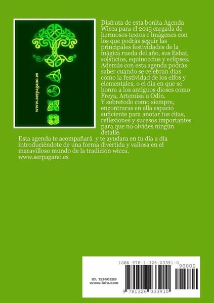 Agenda Wicca 2015 - Ser Pagano. Disfruta de esta bonita Agenda Wicca para el 2015 cargada de hermosos textos e imágenes con los que podrás seguir las principales festividades de la mágica rueda del año, sus Esbat, solsticios, equinoccios y eclipses. Además con esta agenda podrás saber cuando se celebran días como la festividad de los elfos y elementales, o el día en que se honra a los antiguos dioses como Freya, Artemisa u Odín. Y sobretodo como siempre, encontraras en ella espacio suficiente para anotar tus citas,reflexiones y sucesos importantes para que no olvides ningún detalle. Esta agenda te acompañará y te ayudara en tu día a día introduciéndote de una forma divertida y valiosa en el maravilloso mundo de la tradición wicca. www.serpagano.es