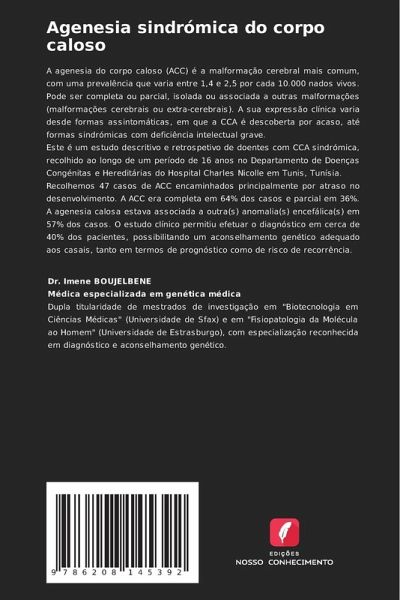 A agenesia do corpo caloso (ACC) é a malformação cerebral mais comum, com uma prevalência que varia entre 1,4 e 2,5 por cada 10.000 nados vivos. Pode ser completa ou parcial, isolada ou associada a outras malformações (malformações cerebrais ou extra-cerebrais). A sua expressão clínica varia desde formas assintomáticas, em que a CCA é descoberta por acaso, até formas sindrómicas com deficiência intelectual grave.Este é um estudo descritivo e retrospetivo de doentes com CCA sindrómica, recolhido ao longo de um período de 16 anos no Departamento de Doenças Congénitas e Hereditárias do Hospital Charles Nicolle em Tunis, Tunísia.Recolhemos 47 casos de ACC encaminhados principalmente por atraso no desenvolvimento. A ACC era completa em 64% dos casos e parcial em 36%. A agenesia calosa estava associada a outra(s) anomalia(s) encefálica(s) em 57% dos casos. O estudo clínico permitiu efetuar o diagnóstico em cerca de 40% dos pacientes, possibilitando um aconselhamento genético adequado aos casais, tanto em termos de prognóstico como de risco de recorrência.