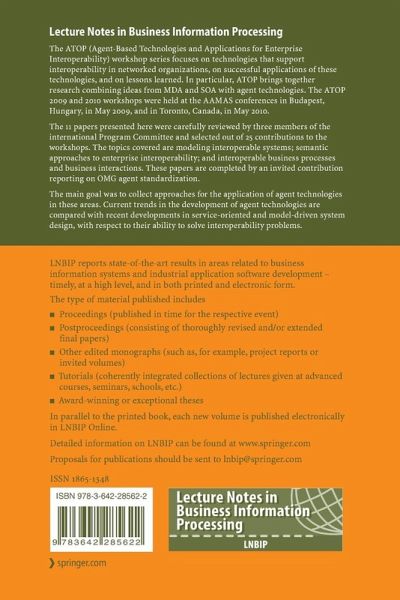 The ATOP (Agent-Based Technologies and Applications for Enterprise Interoperability) workshop series focuses on technologies that support interoperability in networked organizations, on successful applications of these technologies, and on lessons learned. In particular, ATOP brings together research combining ideas from MDA and SOA with agent technologies. The ATOP 2009 and 2010 workshops were held at the AAMAS conferences in Budapest, Hungary, in May 2009, and in Toronto, Canada, in May 2010.The 11 papers presented here were carefully reviewed by three members of the international Program Committee and selected out of 25 contributions to the workshops. The topics covered are modeling interoperable systems; semantic approaches to enterprise interoperability; and interoperable business processes and business interactions. These papers are completed by an invited contribution reporting on OMG agent standardization.The main goal was to collect approaches for the application of agent technologies in these areas. Current trends in the development of agent technologies are compared with recent developments in service-oriented and model-driven system design, with respect to their ability to solve interoperability problems.
