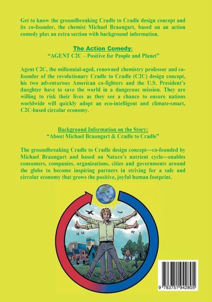 In this illustrated Young Adult novel, Agent C2C, the millennial-aged, renowned chemistry professor and co-founder of the revolutionary Cradle to Cradle (C2C) design concept, his two adventurous American co-fighters and the U.S. President's daughter have to save the world in a dangerous mission. They are willing to risk their lives as they see a chance to ensure nations worldwide will quickly adopt an eco-intelligent and climate-smart, C2C-based circular economy.Get to know the groundbreaking Cradle to Cradle design concept and its co-founder, the chemist Michael Braungart, based on an action comedy plus an extra section with background information including the Title Song AGENT C2C as sheet music.