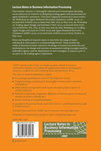 This volume contains 12 thoroughly refereed and revised papers detailing recent advances in research on designing trading agents and mechanisms for agent-mediated e-commerce. They were originally presented at three events: the Workshop on Agent-Mediated Electronic Commerce (AMEC 2013), co-located with AAMAS 2013 in Saint Paul, MN, USA, in May 2013; the Workshop on Trading Agent Design and Analysis (TADA 2013), co-located with AAAI 2013 in Bellevue, WA, USA, in July 2013; and the Joint Workshop on Trading Agent Design and Analysis (TADA 2014) and Agent-Mediated Electronic Commerce (AMEC 2014), co-located with AAMAS 2014 in Paris, France, in May 2014.