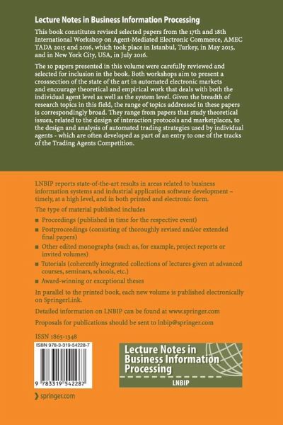 This book constitutes revised selected papers from the 17th and 18th International Workshop on Agent-Mediated Electronic Commerce, AMEC TADA 2015 and 2016, which took place in Istanbul, Turkey, in May 2015, and in New York City, USA, in July 2016.