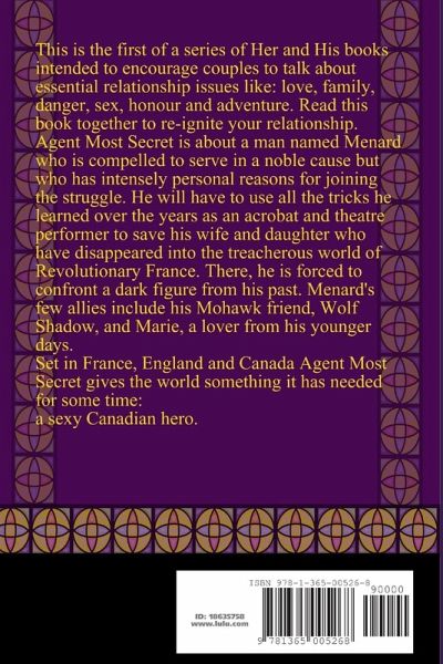 This is a Her and His book written for couples who want to share a fun and entertaining experience that will encourage them to talk about important issues like: love, family, honour, adventure, sex, danger, and travel. Set in the romantic and dynamic days of the French Revolution Agent Most Secret is a book intended to be of interest to both women and men and will be of particular interest to middle-aged couples. If you are looking for a way to re-kindle a relationship this book is a very good start.