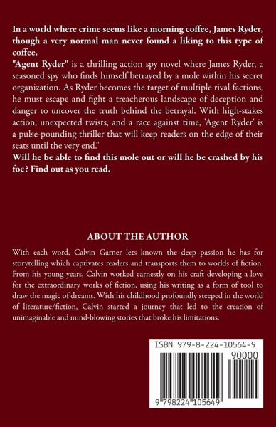 In a world where crime seems like a morning coffee, James Ryder, though a very normal man never found a liking to this type of coffee. "Agent Ryder" is a thrilling action spy novel where James Ryder, a seasoned spy who finds himself betrayed by a mole within his secret organization. As Ryder becomes the target of multiple rival factions, he must escape and fight a treacherous landscape of deception and danger to uncover the truth behind the betrayal. With high-stakes action, unexpected twists, and a race against time, 'Agent Ryder' is a pulse-pounding thriller that will keep readers on the edge of their seats until the very end." Will he be able to find this mole out or will he be crashed by his foe? Find out as you read.