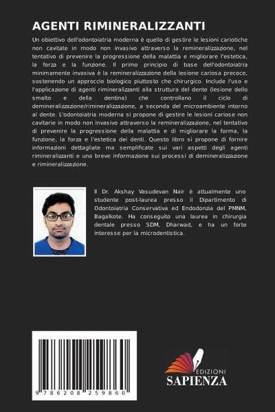 Un obiettivo dell'odontoiatria moderna è quello di gestire le lesioni cariotiche non cavitate in modo non invasivo attraverso la remineralizzazione, nel tentativo di prevenire la progressione della malattia e migliorare l'estetica, la forza e la funzione. Il primo principio di base dell'odontoiatria minimamente invasiva è la remineralizzazione della lesione cariosa precoce, sostenendo un approccio biologico piuttosto che chirurgico. Include l'uso e l'applicazione di agenti rimineralizzanti alla struttura del dente (lesione dello smalto e della dentina) che controllano il ciclo di demineralizzazione/rimineralizzazione, a seconda del microambiente intorno al dente. L'odontoiatria moderna si propone di gestire le lesioni cariose non cavitarie in modo non invasivo attraverso la remineralizzazione, nel tentativo di prevenire la progressione della malattia e di migliorare la forma, la funzione, la forza e l'estetica dei denti. Questo libro si propone di fornire informazioni dettagliate ma semplificate sui vari aspetti degli agenti rimineralizzanti e una breve informazione sui processi di demineralizzazione e rimineralizzazione.