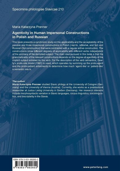 This book presents a synchronic study on the applicability and the acceptability of the passive and three impersonal constructions in Polish (-no/-to, reflexive, and 3pl) and Russian (3pl construction) that were contrasted with a regular active construction. The constructions show different degrees of applicability with different verbs independent of the animacy of the demoted subject. The main idea pursued in this book is that the grammaticality of the relevant constructions depends on the degree of agentivity of the implicit subject entailed by the verb. For the description of the verb semantics Dowty's proto-role model (1991) is used, which operates by summing up the proto-agent, and the proto-patient entailments to determine how much 'agent-like' or 'patient-like' a semantic role is.
