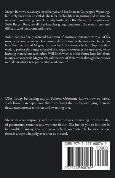 Megan Barrows has always loved her job and her home in Culpepper, Wyoming, but lately she's been unsettled. She feels like her life is stagnating and it's time to move onto something more. Her daily battles with Bob Bickel, the proprietor of Bob's Burger Barn, are all that keep her going sometimes. The man is testy and difficult…and handsome and sweet. Bob Bickel has finally achieved his dream of owning a restaurant with all of his own recipes on the menu. He's having a difficult time perfecting a taco burger, so he enlists the help of Megan, the most faithful customer he has. Together they work to perfect the burger several of the pregnant women in the area crave, while learning more about each other. Will Bob's worries of the future keep him from taking a chance with Megan? Or will the two of them work through their issues to find out what a true partnership could mean?