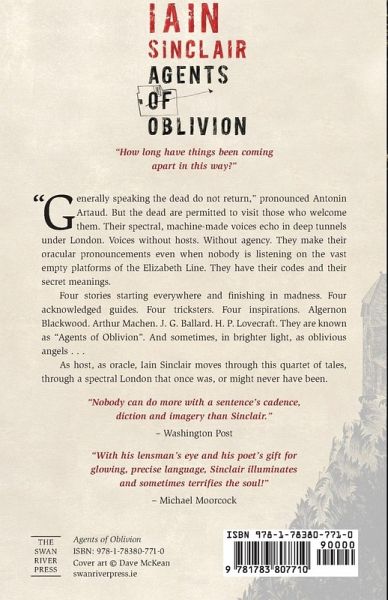 "How long have things been coming apart in this way?" - The Lure of Silence "Generally speaking the dead do not return," pronounced Antonin Artaud. But the dead are permitted to visit those who welcome them. Their spectral, machine-made voices echo in deep tunnels under London. Voices without hosts. Without agency. They make their oracular pronouncements even when nobody is listening on the vast empty platforms of the Elizabeth Line. They have their codes and their secret meanings. Four stories starting everywhere and finishing in madness. Four acknowledged guides. Four tricksters. Four inspirations. Algernon Blackwood. Arthur Machen. J. G. Ballard. H. P. Lovecraft. They are known as "Agents of Oblivion". And sometimes, in brighter light, as oblivious angels . . . As host, as oracle, Iain Sinclair moves through this quartet of tales, through a spectral London that once was, or might never have been.