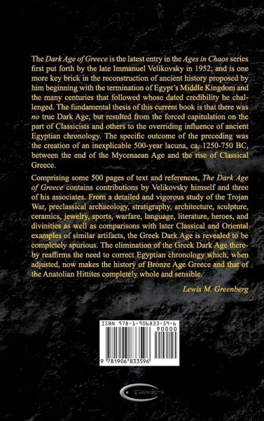 The Dark Age of Greece is the latest entry in the Ages in Chaos series first put forth by the late Immanuel Velikovsky in 1952; and is one more key brick in the reconstruction of ancient history proposed by him beginning with the termination of Egypt's Middle Kingdom and the many centuries that followed whose dated credibility he challenged. The fundamental thesis of this current book is that there was no true Dark Age, but resulted from the forced capitulation on the part of Classicists and others to the overriding influence of ancient Egyptian chronology. The specific outcome of the preceding was the creation of an inexplicable 500-year lacuna, ca. 1250-750 BC, between the end of the Mycenaean Age and the rise of Classical Greece. Comprising some 500 pages of text and references, The Dark Age of Greece contains contributions by Velikovsky himself and three of his associates. From a detailed and vigorous study of the Trojan War, preclassical archaeology, stratigraphy, architecture, sculpture, ceramics, jewelry, sports, warfare, language, literature, heroes, and divinities as well as comparisons with later Classical and Oriental examples of similar artifacts, the Greek Dark Age is revealed to be completely spurious. The elimination of the Greek Dark Age thereby reaffirms the need to correct Egyptian chronology which, when adjusted, now makes the history of Bronze Age Greece and that of the Anatolian Hittites completely whole and sensible.