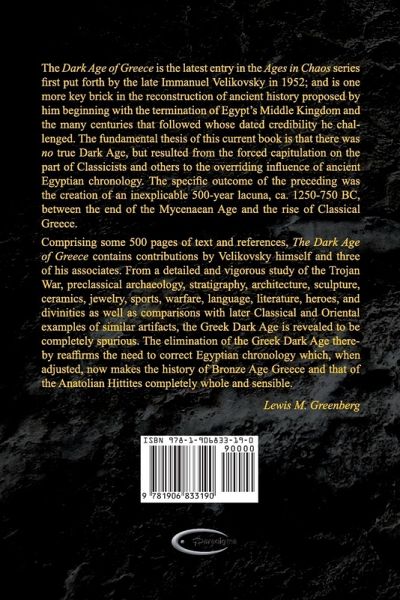 The Dark Age of Greece is the latest entry in the Ages in Chaos series first put forth by the late Immanuel Velikovsky in 1952; and is one more key brick in the reconstruction of ancient history proposed by him beginning with the termination of Egypt's Middle Kingdom and the many centuries that followed whose dated credibility he challenged. The fundamental thesis of this current book is that there was no true Dark Age, but resulted from the forced capitulation on the part of Classicists and others to the overriding influence of ancient Egyptian chronology. The specific outcome of the preceding was the creation of an inexplicable 500-year lacuna, ca. 1250-750 BC, between the end of the Mycenaean Age and the rise of Classical Greece. Comprising some 500 pages of text and references, The Dark Age of Greece contains contributions by Velikovsky himself and three of his associates. From a detailed and vigorous study of the Trojan War, preclassical archaeology, stratigraphy, architecture, sculpture, ceramics, jewelry, sports, warfare, language, literature, heroes, and divinities as well as comparisons with later Classical and Oriental examples of similar artifacts, the Greek Dark Age is revealed to be completely spurious. The elimination of the Greek Dark Age thereby reaffirms the need to correct Egyptian chronology which, when adjusted, now makes the history of Bronze Age Greece and that of the Anatolian Hittites completely whole and sensible.