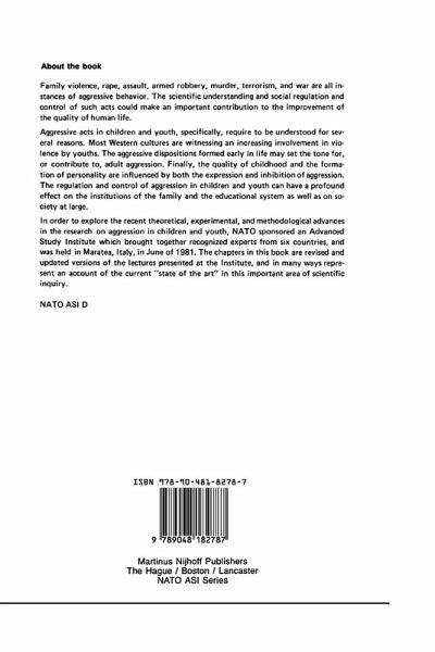 Human aggression is a fascinating research topic, but it is of much more than academic importance. To a large extent, the quality of life and perhaps even world survival depend on an adequate understanding of human aggression. Family vi o lence (child battering and spouse abuse), rape, assault, armed robbery, murder, terrorism, and war are all instances of various types of aggression. The ability to regulate and control such acts could have a crucial contribution to the improvement of the quality of life. Aggressive acts in children and youth need to be under stood for three major reasons. First, most Western cultures are witnessing an increasing involvement in violence by youths. Second, the aggressive dispositions formed early in life may set the tone for or contribute to adult aggression. Third, the quality of childhood and the formation of personal ity are influenced by both the expression and inhibition of aggression. The regulation and control of aggression in children and youth can have a profound effect on the institu tions of the family and the educational system as well as on society at large. Most societies are dedicated to maintain ing harmony and to providing nonviolent solutions to human problems and social conflict. A substantial amount of knowledge has accumulated about aggression and its regulation from empirical research, theory, and clinical sources. Because of the social importance of aggression, the study of human aggression in children and youth has become a popular area for scientific research.