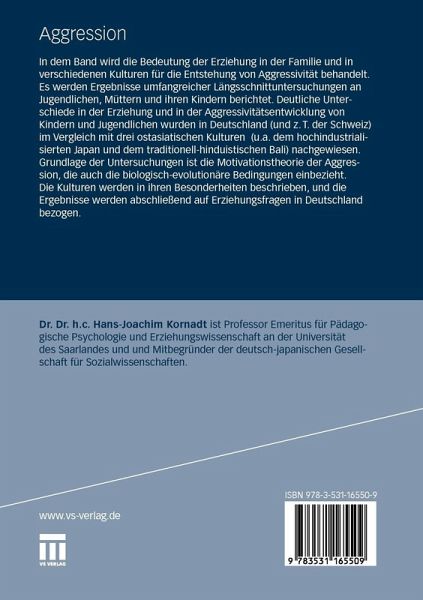 In dem Band wird die Bedeutung der Erziehung in der Familie und in verschiedenen Kulturen für die Entstehung von Aggressivität behandelt. Es werden Ergebnisse umfangreicher Untersuchungen an Jugendlichen, Müttern und ihren Kindern berichtet. Diese beruhen auf verschiedenen psychologischen Verfahren, von Fragebogen bis zu Beobachtungen, die zu mehreren Zeitpunkten angewandt wurden Deutliche Unterschiede in der Erziehung und in der Aggressivitätsentwicklung von Kindern und Jugendlichen wurden in Deutschland (und z.T. der Schweiz) im Vergleich mit drei ostasiatischen Kulturen (u.a. dem konfuzianisch geprägten Japan und dem hinduistischen Bali) nachgewiesen. Über sehr verschiedene Kulturen hinweg wird die langfristige Bedeutung der frühen Erziehung für die Entwicklung bis zur Pubertät festgestellt.
