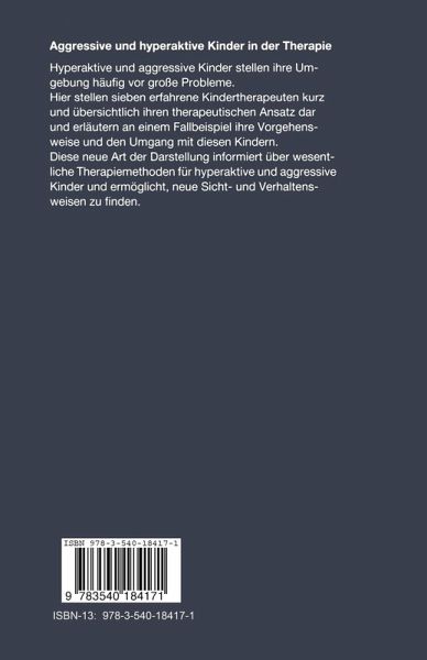 Klassifikation und neurobiologischer Hintergrund des hyperkinetischen Syndroms (HKS).- 1 Einleitung.- 2 Begriffsentwicklung und Klassifikation.- 3 Neurobiologischer Hintergrund.- 4 Schlußbetrachtung.- Literatur.- Das hyperaktive Kind in der logopädischen Praxis.- 1 Der Anspruch.- 2 Die Kompetenz.- 3 Die Anamnese.- 4 Beispiel Michael.- 5 Der Raum.- 6 Das Licht.- 7 Therapeutisches Vorgehen.- 8 Das Material.- 9 Der Überraschungseffekt.- 10 Behandlung.- 11 Voraussetzungen zur Durchführung der Therapie.- 12 Durchführung der Therapie.- 13 Zusammenfassung.- Literatur.- Ergotherapie bei hyperaktiven Kindern.- 1 Prinzipien der sensomotorischen Behandlung.- 2 Hyperaktivitätssyndrom aus der Sicht der Ergotherapie.- 3 Die Überprüfung der sensomotorischen Funktionen.- 4 Die Behandlung der sensomotorischen Störungen beim hyperaktiven Kind.- Literatur.- Kognitiv-verhaltenstherapeutische Interventionen bei hyperaktiv-aggressiven Kindern.- 1 Hyperaktive Kinder und ihre behandlungsbedürftigen Probleme.- 2 Hyperaktivität als dysregulatorische Störung - eine handlungsanleitende psychologische Modellvorstellung.- 3 Die kognitiv-verhaltenstherapeutische Intervention.- 4 Abschließende Bemerkungen.- Literatur.- Überlegungen zur Therapie hyperaktiver und aggressiver Kinder.- 1 Einleitung.- 2 Individualpsychologische Gedanken zum Thema "Sorgenkinder".- 3 Historischer Rückblick.- 4 Fallbeispiele.- 5 Das spezielle Problem der hyperaktiven und aggressiven Kinder.- Literatur.- Möglichkeiten des Kinder- und Jugendlichenpsychotherapeuten beim Umgang mit dem hyperkinetischen und aggressiven Kind.- 1 Vorstellung der analytischen Kinderpsychotherapie.- 2 Hyperkinese und analytische Kinderpsychotherapie.- 3 Ein Fallbeispiel.- 4 Zusammenfassung.- Weiterführende Literatur.- Theraplayfür das aggressive Kind.- 1 Was ist Theraplay?.- 2 Anwendung von Theraplay.- 3 Zur Psychodynamik des aggressiven Kindes.- 4 Ein Fallbeispiel.- 5 Zusammenfassung.- Literatur.- Personenzentrierte Psychotherapie bei aggressiven Kindern.- 1 Das thematische Feld.- 2 Theorie der personenzentrierten Kinderpsychotherapie.- 3 Kurzauszug aus der Therapie mit Kurt.- Literatur.- Kommentierte Bibliographie.- Namenverzeichnis.