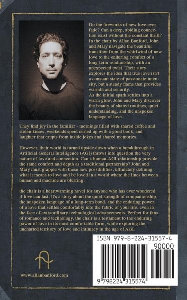 Do the fireworks of new love ever fade? Can a deep, abiding connection exist without the constant thrill? In the chair by Allan Banford, John and Mary navigate the beautiful transition from the whirlwind of new love to the enduring comfort of a long-term relationship, with an unexpected twist. Their story explores the idea that true love isn't a constant state of passionate intensity, but a steady flame that provides warmth and security. As the initial spark settles into a warm glow, John and Mary discover the beauty of shared routines, quiet understanding, and the unspoken language of love. They find joy in the familiar - mornings filled with shared coffee and stolen kisses, weekends spent curled up with a good book, and laughter that erupts from inside jokes and shared memories. However, their world is turned upside down when a breakthrough in Artificial General Intelligence (AGI) throws into question the very nature of love and connection. Can a human-AGI relationship provide the same comfort and depth as a traditional partnership? John and Mary must grapple with these new possibilities, ultimately defining what it means to love and be loved in a world where the lines between human and machine are blurring. the chair is a heartwarming novel for anyone who has ever wondered if love can last. It's a story about the quiet strength of companionship, the unspoken language of a long-term bond, and the enduring power of a love that settles comfortably into the fabric of your life, even in the face of extraordinary technological advancements. Perfect for fans of romance and technology, the chair is a testament to the enduring power of love in its most comfortable form, while exploring the uncharted territory of love and intimacy in the age of AGI.
