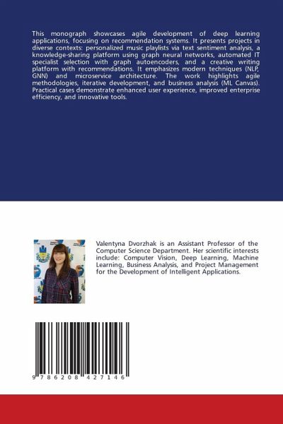 This monograph showcases agile development of deep learning applications, focusing on recommendation systems. It presents projects in diverse contexts: personalized music playlists via text sentiment analysis, a knowledge-sharing platform using graph neural networks, automated IT specialist selection with graph autoencoders, and a creative writing platform with recommendations. It emphasizes modern techniques (NLP, GNN) and microservice architecture. The work highlights agile methodologies, iterative development, and business analysis (ML Canvas). Practical cases demonstrate enhanced user experience, improved enterprise efficiency, and innovative tools.