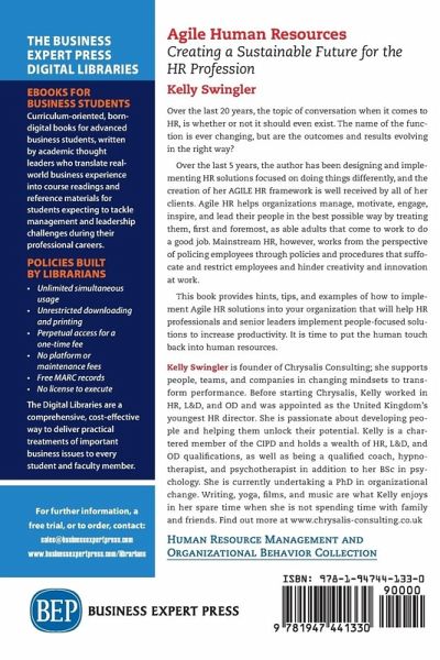 Over the last 20 years, the topic of conversation when it comes to HR, is whether or not it should even exist. The name of the function is ever changing, but are the outcomes and results evolving in the right way? Over the last 5 years, the author has been designing and implementing HR solutions focused on doing things differently, and the creation of her AGILE HR framework is well received by all of her clients. Agile HR helps organizations manage, motivate, engage, inspire, and lead their people in the best possible way by treating them, first and foremost, as able adults that come to work to do a good job. Mainstream HR, however, works from the perspective of policing employees through policies and procedures that suffocate and restrict employees and hinder creativity and innovation at work. This book provides hints, tips, and examples of how to implement Agile HR solutions into your organization that will help HR professionals and senior leaders implement people-focused solutions to increase productivity. It is time to put the human touch back into human resources.