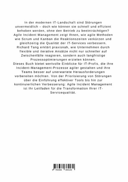 In der modernen IT-Landschaft sind Störungen unvermeidlich - doch wie können sie schnell und effizient behoben werden, ohne den Betrieb zu beeinträchtigen? Agile Incident Management zeigt Ihnen, wie agile Methoden wie Scrum und Kanban die Reaktionszeiten verkürzen und gleichzeitig die Qualität der IT-Services verbessern. Richard Tang erklärt praxisnah, wie Unternehmen durch flexible und iterative Ansätze nicht nur schneller auf Zwischenfälle reagieren, sondern auch langfristige Prozessoptimierungen erzielen können.Dieses Buch bietet wertvolle Einblicke für IT-Profis, die ihre Incident-Management-Prozesse agiler gestalten und ihre Teams besser auf unerwartete Herausforderungen vorbereiten möchten. Von der Priorisierung von Störungen über die Einführung effektiver Tools bis hin zur kontinuierlichen Verbesserung: Agile Incident Management ist Ihr Leitfaden für die Transformation Ihrer IT-Servicequalität.