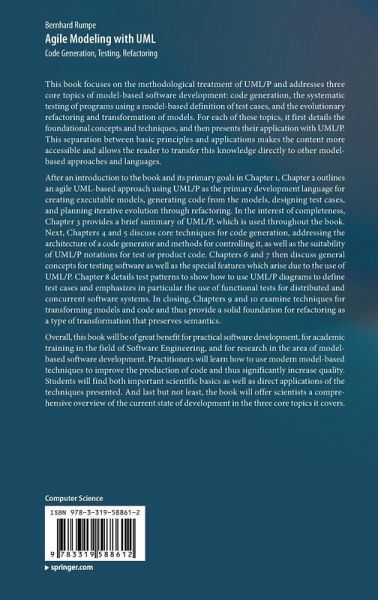 After an introduction to the book and its primary goals in Chapter 1, Chapter 2 outlines an agile UML-based approach using UML/P as the primary development language for creating executable models, generating code from the models, designing test cases, and planning iterative evolution through refactoring. In the interest of completeness, Chapter 3provides a brief summaryof UML/P, which is used throughout the book. Next, Chapters 4 and 5 discuss core techniques for code generation, addressing the architecture of a code generator and methods for controlling it, as well as the suitability of UML/P notations for test or product code. Chapters 6 and 7 then discuss general concepts for testing software as well as the special features which arise due to the use of UML/P. Chapter 8 details test patterns to show how to use UML/P diagrams to define test cases and emphasizes in particular the use of functional tests for distributed and concurrent software systems. In closing, Chapters 9 and 10 examine techniques for transforming models and code and thus provide a solid foundation for refactoring as a type of transformation that preserves semantics.