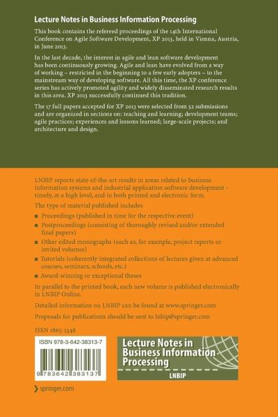 The 17 full papers accepted for XP 2013 were selected from 52 submissions and are organized in sections on: teaching and learning; development teams; agile practices; experiences and lessons learned; large-scale projects; and architecture and design.