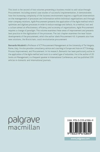 This book is the second of two volumes presenting a business model to add value through Procurement. Including several case studies of successful implementation, it demonstrates how the increasing complexity of the business environment requires a significant intervention on the management of processes and information within individual organizations and through inter-company relations. Agile Procurement presents the application of the Agile method which optimizes and digitizes processes in order to reduce wastage and defects. As a method, tool and a culture aimed at effectiveness, efficiency and economy of organizations, Agile Procurement requires a change of paradigm. This volume examines these areas of improvement and presents best practice in the digitization of the processes. The last chapter examines the near future developments of the procurement, which the author labels Procurement 4.0. It presents also how new solutions, like Blockchain, could revolutionize procurement.