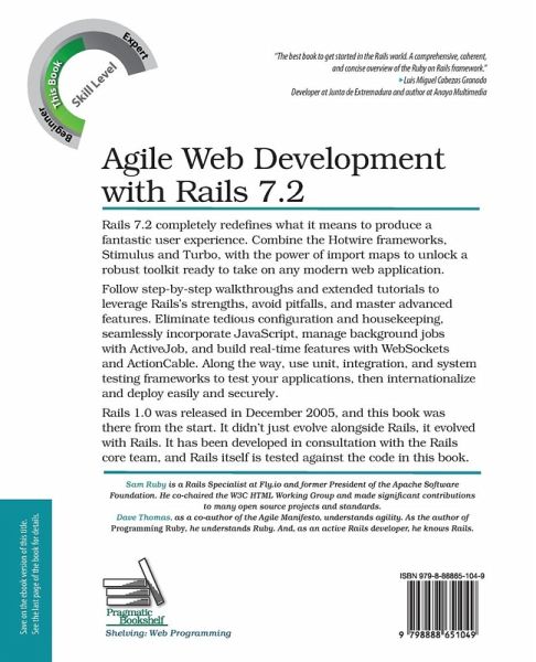 Rails 7.2 completely redefined what it means to produce fantastic user experiences and provides a way to achieve all the benefits of single-page applications - a fraction of the complexity. Rails 7.2 integrated the Hotwire frameworks of Stimulus and Turbo directly as the new defaults, together with that hot newness of import maps. The result is a toolkit so powerful that it allows a single individual to create modern applications upon which they can build a competitive business. The way it used to be. Ruby on Rails helps you produce high-quality, beautiful-looking web applications quickly - you concentrate on creating the application, and Rails takes care of the details. Rails 7.2 brings many improvements, and this edition is updated to cover the new features and changes in best practices. We start with a step-by-step walkthrough of building a real application, and in-depth chapters look at the built-in Rails features. Follow along with an extended tutorial as you write a web-based store application. Eliminate tedious configuration and housekeeping, seamlessly incorporate JavaScript, send and receive emails, manage background jobs with ActiveJob, and build real-time features using WebSockets and ActionCable. Test your applications as you write them using the built-in unit, integration, and system testing frameworks, internationalize your applications, and deploy your applications easily and securely. Rails 1.0 was released in December 2005. This book was there from the start, and didn't just evolve alongside Rails, it evolved with Rails. It has been developed in consultation with the Rails core team. In fact, Rails itself is tested against the code in this book. What You Need: All you need is a Windows, Mac OS X, or Linux machine to do development on. This book will take you through the steps to install Rails and its dependencies. If you aren't familiar with the Ruby programming language, this book contains a chapter that covers the basics necessary to understand the material in the book.