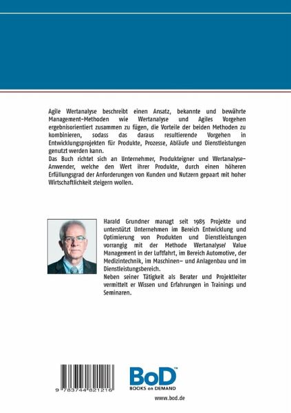 Agile Wertanalyse beschreibt einen Ansatz, bekannte und bewährte Management-Methoden wie Wertanalyse und Agiles Vorgehen ergebnisorientiert zusammen zu fügen, die Vorteile der beiden Methoden zu kombinieren, sodass das daraus resultierende Vorgehen in Entwicklungsprojekten für Produkte, Prozesse, Abläufe und Dienstleistungen genutzt werden kann. Das Buch richtet sich an Unternehmer, Produkteigner und Wertanalyse-Anwender, welche den Wert ihrer Produkte, durch einen höheren Erfüllungsgrad der Anforderungen von Kunden und Nutzern gepaart mit hoher Wirtschaftlichkeit steigern wollen.
