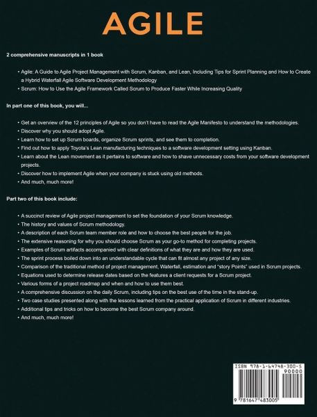 If you want to produce faster while increasing the quality of your products, then keep reading... 2 comprehensive manuscripts in 1 book Agile: A Guide to Agile Project Management with Scrum, Kanban, and Lean, Including Tips for Sprint Planning and How to Create a Hybrid Waterfall Agile Software Development Methodology Scrum: How to Use the Agile Framework Called Scrum to Produce Faster While Increasing Quality The word Agile gets thrown around a lot in software development circles but what exactly does it entail? You have probably seen whiteboards filled up with post-it notes somewhere, either in pictures or TV shows. Ever wonder what they are used for in a production setting? This book will give you an overview of Agile methodologies and how you can use them to speed up development and drive customer satisfaction. In part one of this book, you will... Get an overview of the 12 principles of Agile so you don’t have to read the Agile Manifesto to understand the methodologies. Discover why you should adopt Agile. Learn how to set up Scrum boards, organize Scrum sprints, and see them to completion. Find out how to apply Toyota’s Lean manufacturing techniques to a software development setting using Kanban. Learn about the Lean movement as it pertains to software and how to shave unnecessary costs from your software development projects. Discover how to implement Agile when your company is stuck using old methods. And much, much more! Part two of this book include: A succinct review of Agile project management to set the foundation of your Scrum knowledge. The history and values of Scrum methodology. A description of each Scrum team member role and how to choose the best people for the job. The extensive reasoning for why you should choose Scrum as your go-to method for completing projects. Examples of Scrum artifacts accompanied with clear definitions of what they are and how they are used. The sprint process boiled down into an understandable cycle that can fit almost any project of any size. Comparison of the traditional method of project management, Waterfall, estimation and "story Points" used in Scrum projects. Equations used to determine release dates based on the features a client requests for a Scrum project. Various forms of a project roadmap and when and how to use them best. A comprehensive discussion on the daily Scrum, including tips on the best use of the time in the stand-up. Two case studies presented along with the lessons learned from the practical application of Scrum in different industries. Additional tips and tricks on how to become the best Scrum company around. And much, much more! Get this book now to learn more about Agile and Scrum!