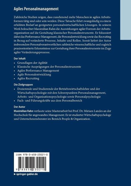 Zahlreiche Studien zeigen, dass zunehmend mehr Menschen in agilen Arbeitsformen tätig sind oder sein werden. Diese Tatsache führt zwangsläufig zu einem erhöhten Bedarf an geeigneten personalwirtschaftlichen Lösungen. In seinem Werk beleuchtet Maximilian Rahn die Auswirkungen agiler Formen der Arbeitsorganisation auf die Gestaltung klassischer Personalinstrumente. Er fokussiert dabei das Performance Management, die Personalentwicklung sowie das Recruiting in Bezug auf veränderte Prozesse, Inhalte und Rollen. Somit liefert der Autor insbesondere Personalverantwortlichen zahlreiche wissenschaftliche und zugleich praxisorientierte Erkenntnisse zur Gestaltung ihrer Personalinstrumente im Zuge agiler Veränderungsprozesse.