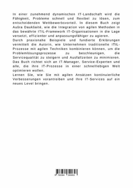 In einer zunehmend dynamischen IT-Landschaft wird die Fähigkeit, Probleme schnell und flexibel zu lösen, zum entscheidenden Wettbewerbsvorteil. In diesem Buch zeigt Ausra Dauksait , wie die Integration von agilen Methoden in das bewährte ITIL-Framework IT-Organisationen in die Lage versetzt, effizienter und anpassungsfähiger zu agieren.Durch praxisnahe Beispiele und fundierte Erklärungen vermittelt die Autorin, wie Unternehmen traditionelle ITIL-Prozesse mit agilen Techniken kombinieren können, um die Problemlösungsprozesse zu beschleunigen, die Servicequalität zu steigern und Ausfallzeiten zu minimieren. Das Buch richtet sich an IT-Manager, Service-Experten und alle, die ihre IT-Prozesse in einer schnelllebigen Welt optimieren wollen.Lernen Sie, wie Sie mit agilen Ansätzen kontinuierliche Verbesserungen vorantreiben und Ihre IT-Services auf ein neues Level bringen.