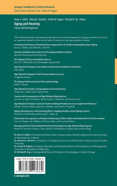 Ch 1: Listening to All Voices: Interdisciplinary Approaches to Understanding Hearing in Aging.- Ch 2: Genetic and Molecular Aspects of the Aging Auditory System.- Ch 3: The Aging Cochlea and Auditory Nerve.- Ch 4: Age-Related Changes in the Auditory Brainstem and Inferior Colliculus .- Ch 5: Age related changes in the primate auditory cortex.- Ch 6: The Aging Auditory System: Electrophysiology.- Ch 7: Age-Related Changes in Segregation of Sound Sources.- Ch 8: Causes and Consequences of Age-Related Hearing Loss.- Ch 9: Age-Related Changes in Speech Understanding: Peripheral versus Cognitive Influences.- Ch 10: Aging, Hearing Loss, and Listening Effort: Imaging Studies of the Aging Listener.- Ch 11: Functional Consequences of Impaired Hearing in Older Adults and Implications for Intervention.- Ch 12: Emerging Clinical Translational Treatment Strategies for Age-Related Hearing Loss.