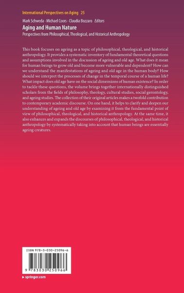 Introduction.- Part I. Ageing and the Human Condition.- Chapter 1. The Individuality of Ageing(Thomas Rentsch).- Chapter 2. The Potentiality of Ageing (Andreas Kruse).- Chapter 3. Dependence and Passivity in Ageing (Heinz Rüegger).- Part II. Ageing, Body, and Space.- Chapter 4. The Ageing Body as Lived History (Wim Dekkers).- Chapter 5. Ageing and Vulnerability (Samia Hurst).- Chapter 6. The Gendered Body and the Experience of Ageing (Maren Wehrle).- Chapter 7. Capturing Space and (Dis-)Embodied Age (Christina Schües).- Part III. Ageing and Time.- Chapter 8. Ageing, Time, and Temporality (Jan Baars).- Chpater 9. Ageing and the Life Course (Mark Schweda).- Chapter 10. The Paradox of Human Finitude (Christine Overall).- Chapter 11. Ageing and Narrativity (Michael Coors).- Part IV. Ageing in Relations.- Chapter 12. Responsible Ageing and the Ethics of Responsiveness (Frits de Lange).- Chapter 13. Ageing and Care (Hartmut Remmers).- Chapter 14. Ageing and Generationality from the Perspective of Historical Anthropology (Jörg Zirfas).- Part V. Anthropological Views of Ageing in Contemporary Discourses and Practices.- Chapter 15. The Meaning of Ageing: Redemption or Liberation? (Ronald Manheimer).- Chapter 16. Ageing in Dignity (Ralf Stoecker, Bielefeld).- Chapter 17. The (Implicit) Anthropology of Bioethics Is Ageist - How Can We Change It? (Søren Holm).- Chapter 18. Spirituality and Transcendence in Old Age (Ralph Kunz).