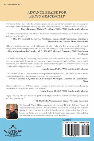 Aging Gracefully: Spiritual Care for the Aging Adults is an excellent resource for pastors, chaplains, social workers, nurses, physicians, geriatric workers, health aides, and caregivers who serve aging adults. It provides information on how to conduct a spiritual assessment, render spiritual care, develop a spiritual care group for aging adults and spiritual self-care tips for caregivers and healthcare providers. This is a must-read for everyone who is caring for an elderly person who wants to age gracefully. "Reverend White has crafted a valuable guide for helping caregivers learn how to engage in meaningful spiritual dialogue with aging adults, so they may reflect on their own life and purpose." -Mary Kummer Naber, President/CEO, PACE Southeast Michigan "Dr. White's contribution will serve as a welcome reference resource to those dedicated to the loving care of the elderly." -Rev. Dr. Kenneth E. Harris, President, Ecumenical Theological Seminary, Senior Pastor, Detroit Bible Tabernacle "There is no doubt that this book will impact all who read it whether an aging adult, personal caregiver or healthcare providers who have chosen caring for this population as their calling." -Gwendolyn Graddy-Dansby, M.D., F.A.C.P. Medical Director, PACE Southeast Michigan "Dr. White skillfully and succinctly describes the existential needs of the elderly in this simple, but spectacular read. Summarizing empirical research, quotes from the brilliant, vast personal experience, and alliterative aids, he provides a comprehensive guide for primary spiritual care for both families and professional caregivers." -Evan Fonger, M.D., PACE Southeast Michigan "Dr. Samuel White, III has authored a comprehensive yet practical handbook for health care professionals and even family members caring for aging adults." -Sue Hammel, RN, BSN, PACE Southeast Michigan, Director of Operations- West "As a social worker for PACE, I highly recommend this book to my co-workers, friends, family members who work in the health care industry." -Linda Bazzy, LMSW, PACE Southeast Michigan "Aging Gracefully tells how a positive spiritual or religious attitude can enhance the aging process and a support group." -M. McBride, Coordinator, Senior/Retiree Program