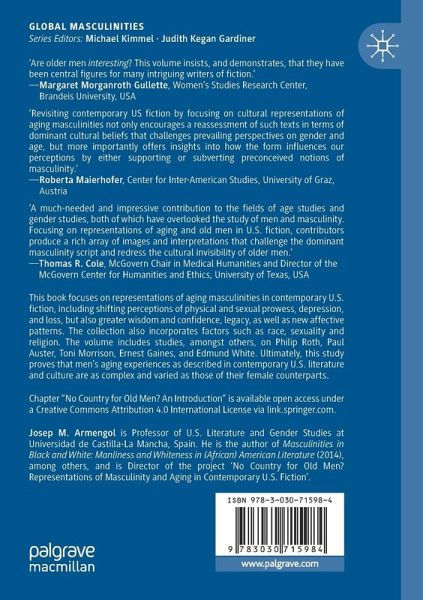 Chapter 1. Josep M. Armengol: No Country for Old Men? An Introduction.- Part I. GENDERING AGE.- Chapter 2. Juan González-Echeverría: Harvest Time for John Updike's Rabbit: Sex Dies Harder than Gender.- Chapter 3. Sarah Hardy: Geographies of Aging in Jhumpa Lahiri's "The Third and Final Continent" and Jeffrey Eugenides' Middlesex.- Chapter 4. Teresa Requena: Literary Representations of Aging Masculinities: Bodies and Privilege.- Part II. MEN'S AGING IN POPULAR FICTION.- Chapter 5. M. Isabel Santaulària I Capdevila: "You are all too old to do anything but get yourselves killed:" Age and Masculinity in Stephen King's It, Dreamcatcher and Doctor Sleep.- Chapter 6. Ángel Mateos-Aparicio: ''To Oldie Go": From James T. Kirk and Jean-Luc Picard to Samuel Lord and the Reconstruction of the Aging Male Body in the Final Frontier.- Part III. OLDER MEN IN AUTOBIOGRAPHY AND MEMOIR.- Chapter 7. Esther Zaplana: Self-Representation 'Between Two': Ageing Males, and the 'Otherness within' in Philip Roth's Patrimony.- Chapter 8. Leonor Acosta-Bustamante: Reconstructing the (Masculine) Self from Old Age: Memories of the Aching Male Body in Paul Auster's Winter Journal.- Part IV. AGING BEYOND WHITENESS.- Chapter 9. Mar Gallego: Black Masculinities and Aging in Toni Morrison's Novels.- Chapter 10. Marta Bosch-Vilarrubias: Aging Men in Contemporary Arab American Literature Written by Women.- Part V. QUEERING AGE.- Chapter 11. Josep M. Armengol: Sex and Text: Queering Older Men's Sexuality in Contemporary U.S. Fiction.- Chapter 12. Ignacio Ramos-Gay & Claudia Alonso-Recarte: On Long-lasting 'Humanimal' Companionships: Gayness, Aging and Disease in Steven Rowley's Lily and the Octopus