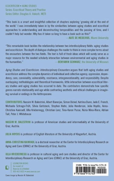 This collection presents the first substantial encounter between aging studies and ecocriticism. By putting both fields into conversation, it addresses competing ideologies of efficiency, exploitation, and endurance versus those of sustenance, care, and survival.