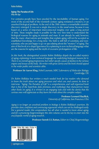 Aging is no longer an unsolved problem in biology is Robin Holliday's assertion. He provides clear, confident and convincing arguments which can not be challenged easily. For a general reader, this compendium has all what is needed to know about aging, and for a practicing biogerontologist this slim volume can be the key to enter into the encyclopedic world of aging research and modulation. Professor Suresh I.S. Rattan, Editor-in-Chief, Biogerontology "In this book, the distinguished scientist Robin Holliday dispels the so-called mystery of aging, explaining in non-technical language the underlying biological reasons for it. There is no overall aging programme or process, but rather specific causes of decline in the various organs and tissues of the body. He writes with great clarity and the book should appeal to the wider public and scientists alike." Professor Sir Aaron Klug, MRC Laboratory of Molecular Biology, Cambridge, UK Dr. Robin Holliday has written a much needed book for lay readers who demand to know the truth about our aging processes and what can, and cannot, be done to intervene. His forty years of fundamental research in the field provides readers with accurate information that puts the lie to much of what has been written by non-professionals and journalists who simply do not have the perspective or scientific foundation to understand how and why we age. Dr. Holliday pays particular attention to exposing the charlatans who exploit the widespread ignorance of how our longevity is determined and why we age. "Aging: The Paradox of Life" is a comprehensive, and well organized book that is free of the hyperbole, false promises, and mythology that characterizes many other books on aging. It is written in an engaging style and with the clarity that the curious ones will appreciate as they learn the truth about this complex subject. Leonard Hayflick, University of California, San Francisco, USA