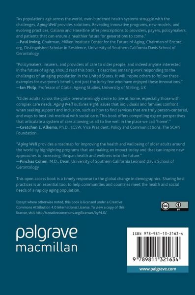 This open access book outlines the challenges of supporting the health and wellbeing of older adults around the world and offers examples of solutions designed by stakeholders, healthcare providers, and public, private and nonprofit organizations in the United States. The solutions presented address challenges including: providing person-centered long-term care, making palliative care accessible in all healthcare settings and the home, enabling aging-in-place, financing long-term care, improving care coordination and access to care, delivering hospital-level and emergency care in the home and retirement community settings, merging health and social care, supporting people living with dementia and their caregivers, creating communities and employment opportunities that are accessible and welcoming to those of all ages and abilities, and combating the stigma of aging. The innovative programs of support and care in Aging Well serve as models of excellence that, when put into action,move health spending toward a sustainable path and greatly contribute to the well-being of older adults.