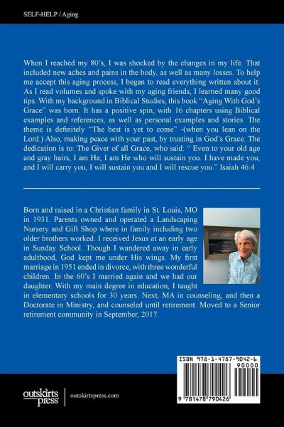 When I reached my 80's, I was shocked by the changes in my life. That included new aches and pains in the body, as well as many losses. To help me accept this aging process, I began to read everything written about it. As I read volumes and spoke with my aging friends, I learned many good tips. With my background in Biblical Studies, this book "Aging With God's Grace" was born. It has a positive spin, with 16 chapters using Biblical examples and references, as well as personal examples and stories. The theme is definitely "The best is yet to come" -(when you lean on the Lord.) Also, making peace with your past, by trusting in God's Grace. The dedication is to: The Giver of all Grace, who said: " Even to your old age and gray hairs, I am He, I am He who will sustain you. I have made you, and I will carry you, I will sustain you and I will rescue you." Isaiah 46:4