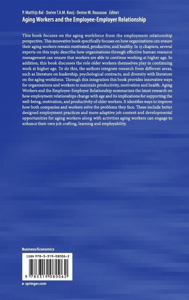 This book focuses on the aging workforce from the employment relationship perspective. This innovative book specifically focuses on how organizations can ensure their aging workers remain motivated, productive and healthy. In 15 chapters, several experts on this topic describe how organizations through effective human resource management can ensure that workers are able to continue working at higher age. In addition, this book discusses the role older workers themselves play in continuing work at higher age. To do this, the authors integrate research from different areas, such as literature on leadership, psychological contracts and diversity with literature on the aging workforce. Through this integration this book provides innovative ways for organizations and workers to maintain productivity, motivation and health. Aging Workers and the Employee-Employer Relationship summarizes the latest research on how employment relationships change with age and its implications for supporting the well-being, motivation and productivity of older workers. It identifies ways to improve how both companies and workers solve the problems they face. These include better designed employment practices and more adaptive job content and developmental opportunities for aging workers along with activities aging workers can engage to enhance their own job crafting, learning and employability.