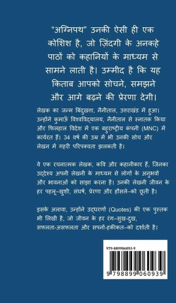 Agnipath is not just a collection of stories-it's a soulful journey through the lanes of struggle, self-discovery, courage, and silent strength. These are tales drawn from everyday life, wrapped in simplicity, yet rich with emotion and depth. The book reminds us that even the smallest of moments can hold the greatest lessons-if we choose to listen. Within these pages, you'll meet: - Mouli, a cow whose innocence teaches true friendship, - Harinath, who earns dignity through honesty and humility, - Rohan, who never stops chasing dreams despite countless failures, - and Naina, a young girl who walks over thorns with a smile on her face. Each story is a mirror-a moment of reflection that connects you with your own emotions, memories, and unspoken thoughts. Whether it's a broken toy, a dusty clock, or an empty chair-everything has something to teach. Dhirendra Singh Bisht's writing is marked by its simplicity and emotional resonance. He does not write to impress; he writes to connect. His characters are not heroes of fantasy, but people like you and me-ordinary lives with extraordinary courage. If you're looking for a book that inspires, heals, and stays with you long after the last page is turned, Agnipath is for you. Because life may not always be easy- but the only way forward is to keep walking. That is... Agnipath.