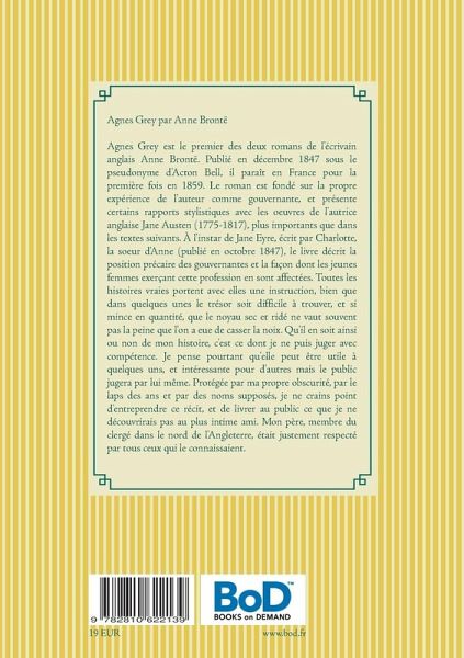 Agnes Grey par Anne BrontëAgnes Grey est le premier des deux romans de l'écrivain anglais Anne Brontë. Publié en décembre 1847 sous le pseudonyme d'Acton Bell, il paraît en France pour la première fois en 1859. Le roman est fondé sur la propre expérience de l'auteur comme gouvernante, et présente certains rapports stylistiques avec les oeuvres de l'autrice anglaise Jane Austen (1775-1817), plus importants que dans les textes suivants. À l'instar de Jane Eyre, écrit par Charlotte, la soeur d'Anne (publié en octobre 1847), le livre décrit la position précaire des gouvernantes et la façon dont les jeunes femmes exerçant cette profession en sont affectées. Toutes les histoires vraies portent avec elles une instruction, bien que dans quelques unes le trésor soit difficile à trouver, et si mince en quantité, que le noyau sec et ridé ne vaut souvent pas la peine que l'on a eue de casser la noix. Qu'il en soit ainsi ou non de mon histoire, c'est ce dont je ne puis juger avec compétence. Je pense pourtant qu'elle peut être utile à quelques uns, et intéressante pour d'autres mais le public jugera par lui même. Protégée par ma propre obscurité, par le laps des ans et par des noms supposés, je ne crains point d'entreprendre ce récit, et de livrer au public ce que je ne découvrirais pas au plus intime ami. Mon père, membre du clergé dans le nord de l'Angleterre, était justement respecté par tous ceux qui le connaissaient. Dans sa jeunesse, il vivait assez confortablement avec les revenus d'un petit bénéfice et d'une propriété à lui. Ma mère, qui l'épousa contre la volonté de ses amis, était la fille d'un squire et une femme de coeur.